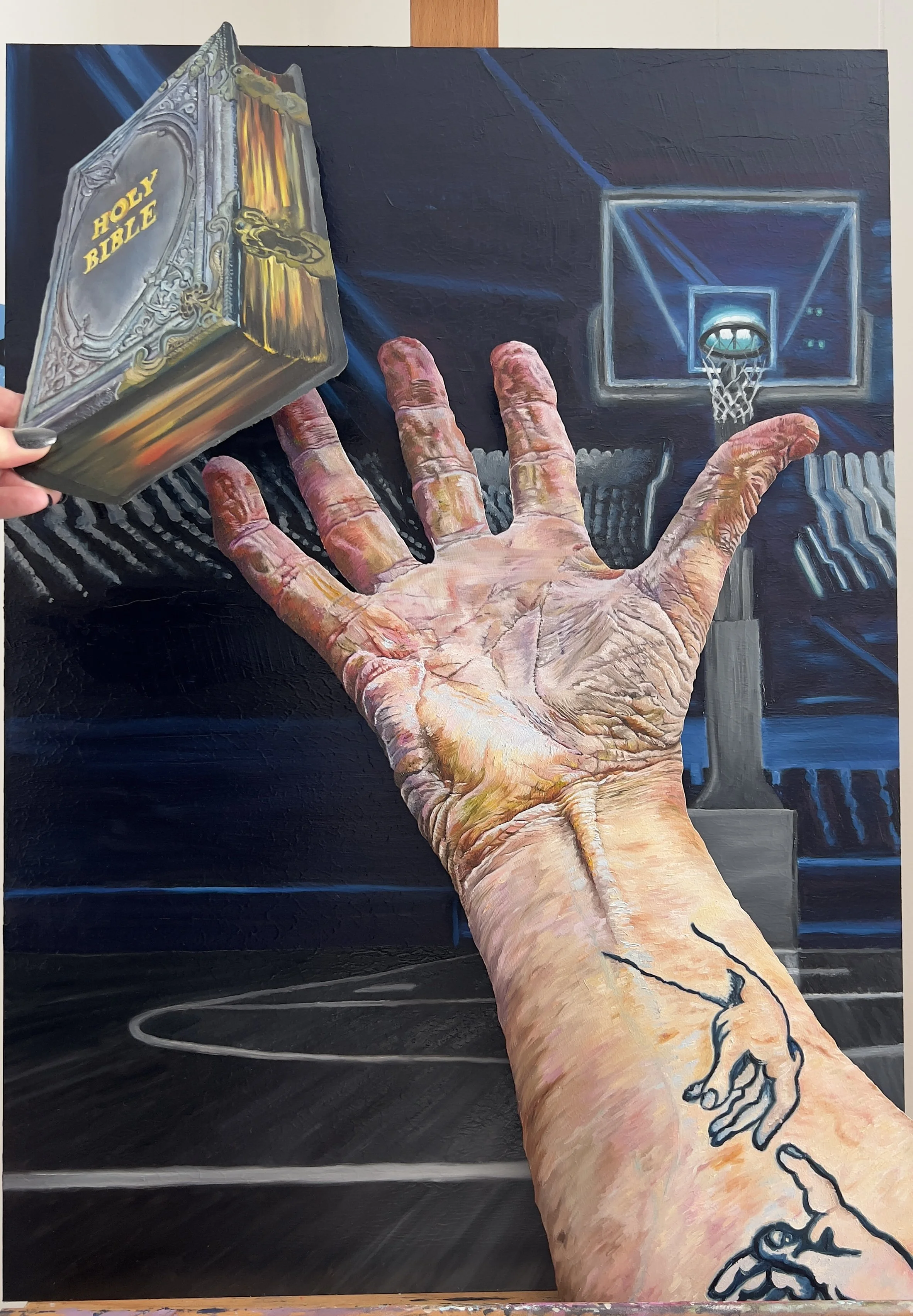 I will be traveling this weekend to visit my family and bringing The Bible portion of the painting to work on while I am at my sissy’s house. I will travel on my motorcycle and this portion of the work is easiest to travel with. Hopefully I don’t smudge it.
